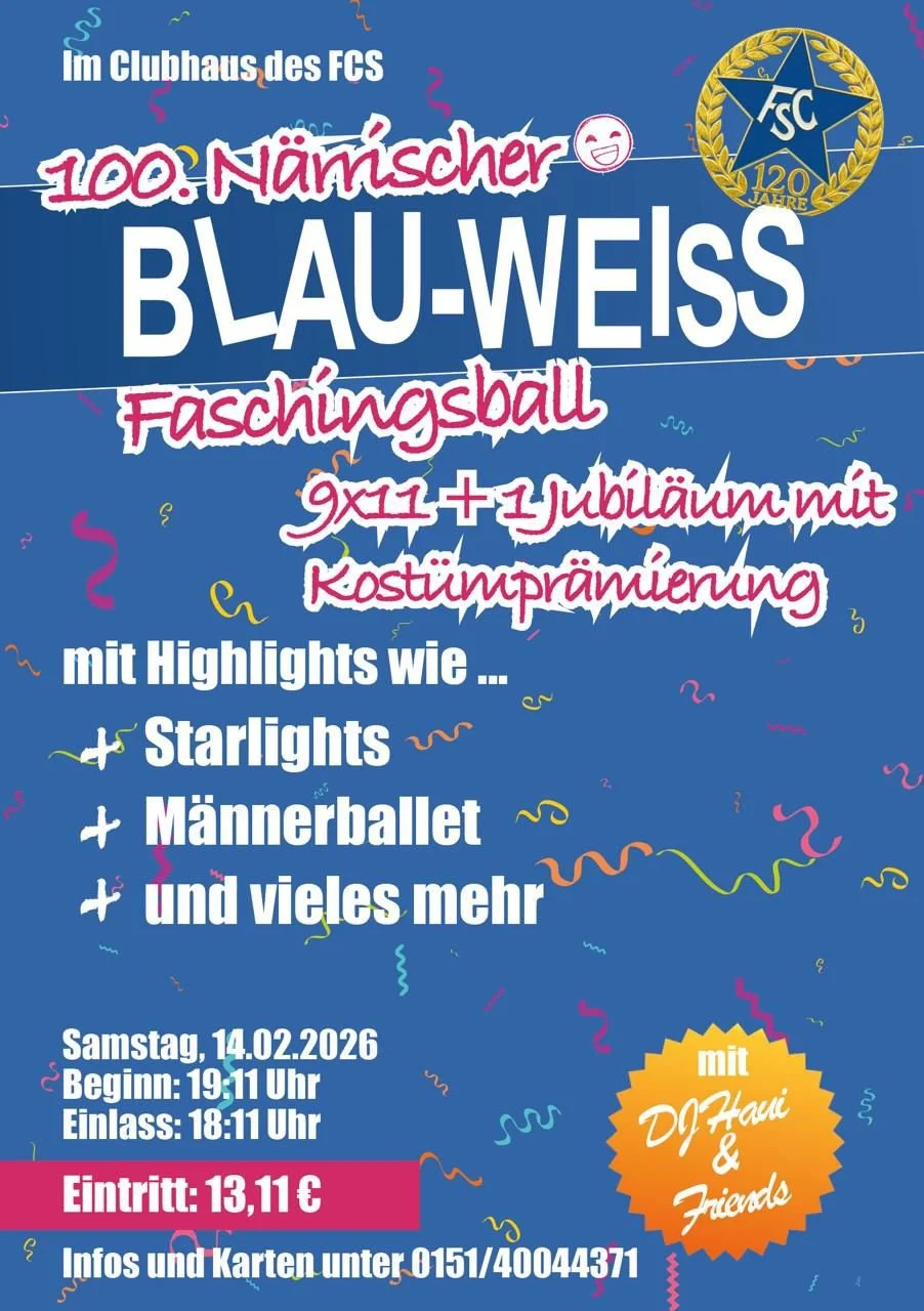 Am Samstag, den 14. Februar 2026, verwandelt sich das Clubhaus des FCS in eine blau-weiße Faschingshochburg. Freut euch auf einen stimmungsvollen Abend voller Musik, Tanz und guter Laune. Natürlich darf auch die Kostümprämierung nicht fehlen – Kreativität ist ausdrücklich erwünscht!