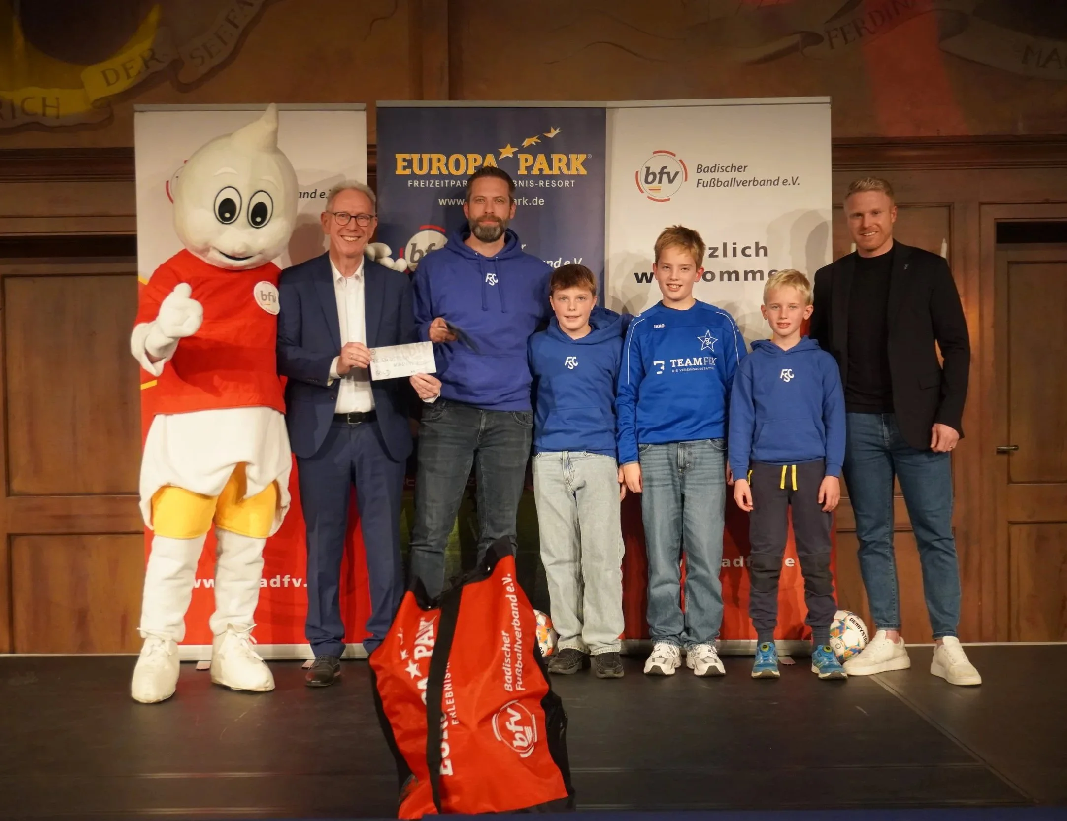 Ein großes gemeinsames Gruppenfoto mit allen Vereinen, bfv-Vertretern sowie den Maskottchen Badi und Ed Euromaus